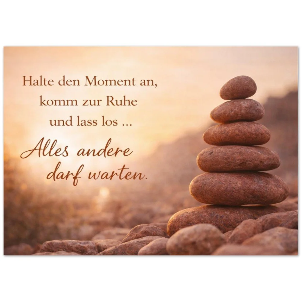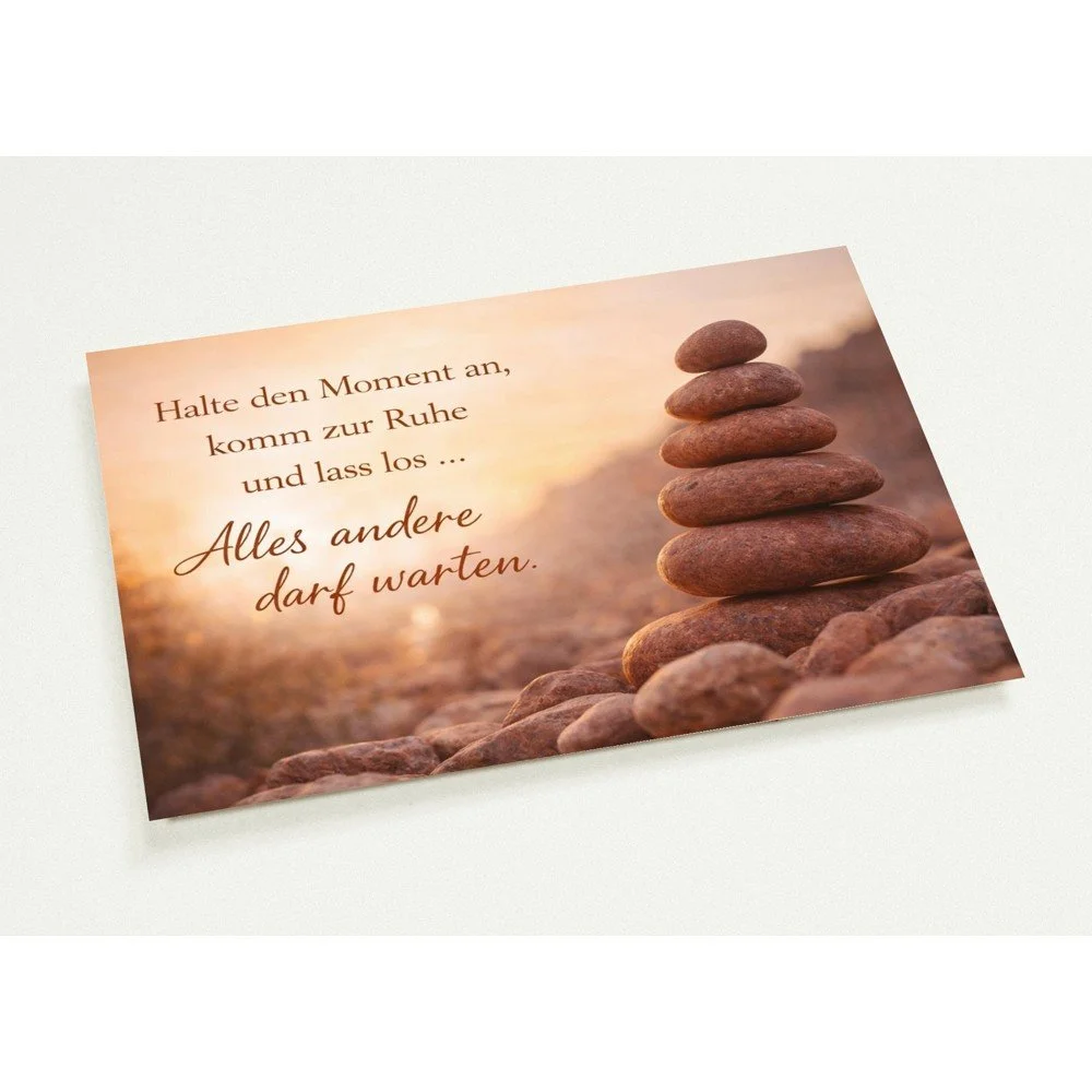 Diese Postkarte zeigt ein ruhiges Naturmotiv mit gestapelten Steinen in warmen, erdigen Farben.